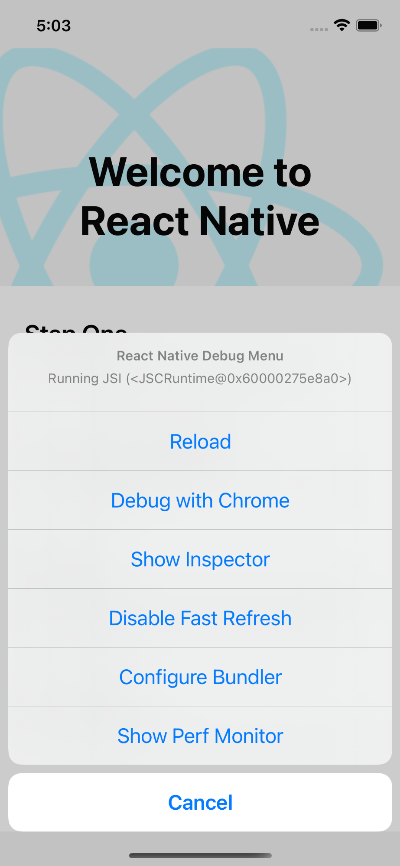 화면에서 디버거를 실행 후, 어플리케이션에서 cmd+m 을 누르고 debug with chrome 을 누르면 디버그를 볼 수 있습니다.