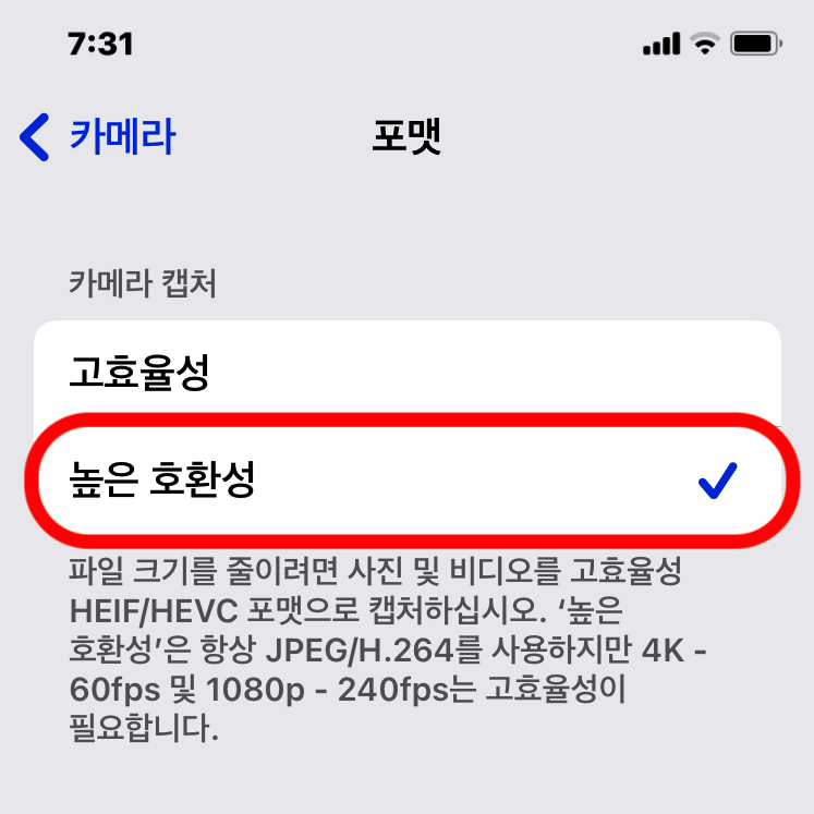 - [카메라 촬영]-[호환성 우선]을 설정합니다.