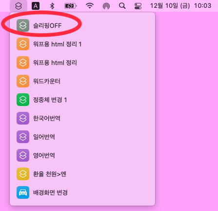 메뉴막대에 고정을 했기 때문에 아래 이미지 처럼 간단하게 활성화 (슬리핑 끄기)를 할 수 있습니다.