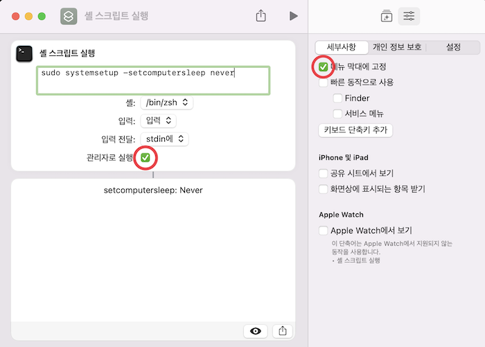 단축어를 실행하고 셀 스크립트 실행 액션을 선택한 후에 절전 모드를 비활성화할 때의 명령 을 입력합니다. 관리자로 실행을 누르고 암호를 입력한 후 메뉴막대에 고정해 둡니다.