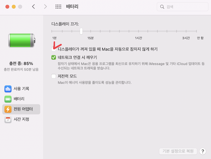 베터리의 항목 좌측의 전원 어댑터를 선택하고, 디스플레이가 꺼져 있을 때 맥을 자동으로 잠자지 않게 하기를 선택해 줍니다. (디스플레이 끄기 안함은 디스플레이 수명이 줄 수 있으므로 비추)