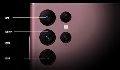 갤럭시 S22 Ultra 리어 카메라 | 광각 : 108MP (어댑티브 셀) 초광각: 12MP 망원 : 12MP(광학 3배 줌) 망원 : 12MP(광학 10배 줌) 펠리스코프 망원 : 12MP (광학 10배 줌) |