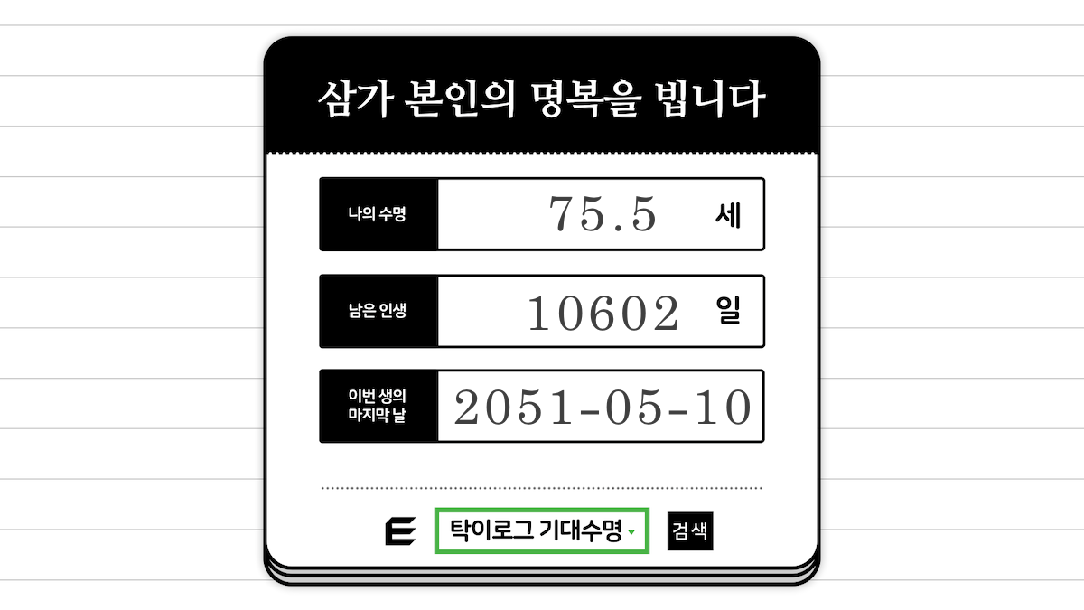 대한민국 지표쳬계에서 인용한 2020년 현재 여자의 기대 수명은 86.5세로 남자의 80.5세 기대 수명을 기준으로 하고 있습니다. 생일을 입력하고 계산하기를 누르면 지금까지 산 날과 남을 날을 계산할 수 있습니다.