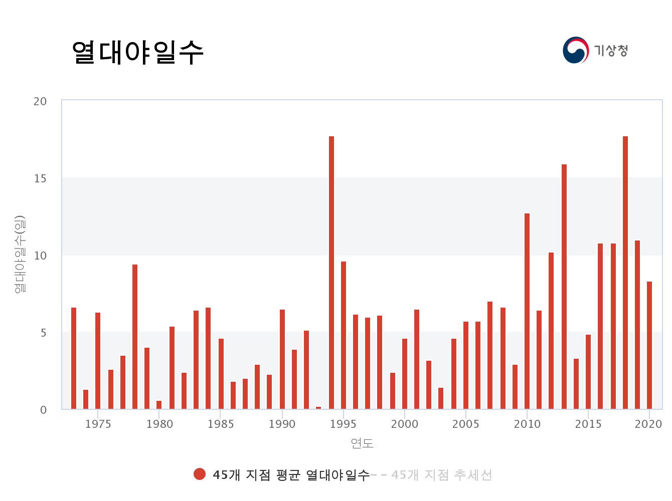 국내 45개 지점의 평균 연중 열대야일수를 나타낸 그래프로 점차 증가하고 있습니다. 1973년에 6.6일이었고, 1994, 2018년에 가장 긴 17.7일이었습니다. 2020년까지 1.3일/10yr 비율로 증가하고 있습니다.