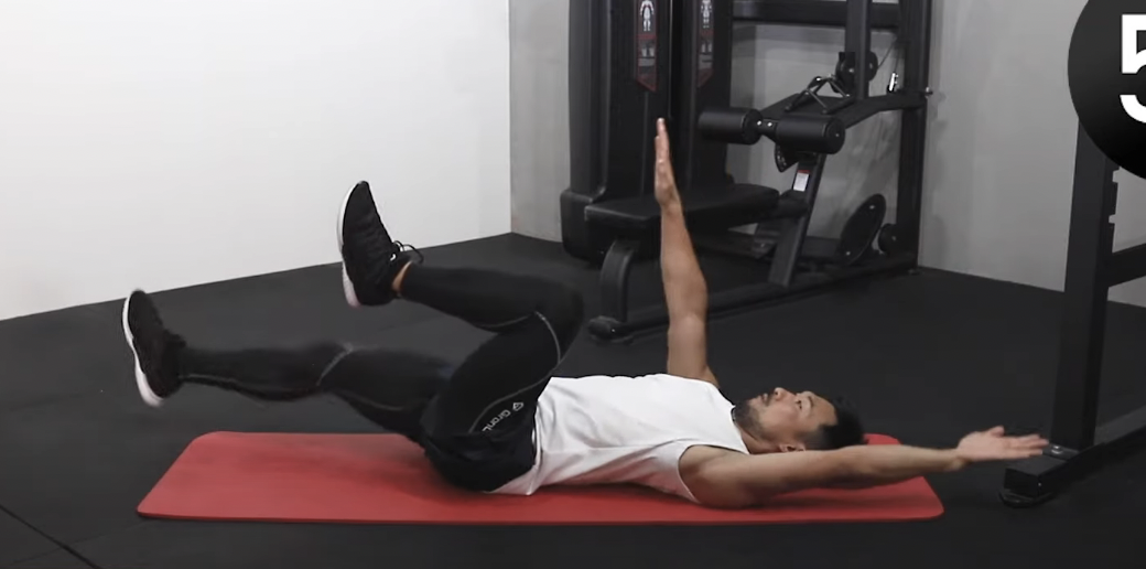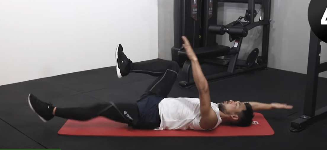 누워서 위를 향해 팔을 뻗고 양 다리는 무릎을 구부린 상태에서 들어 올립니다.