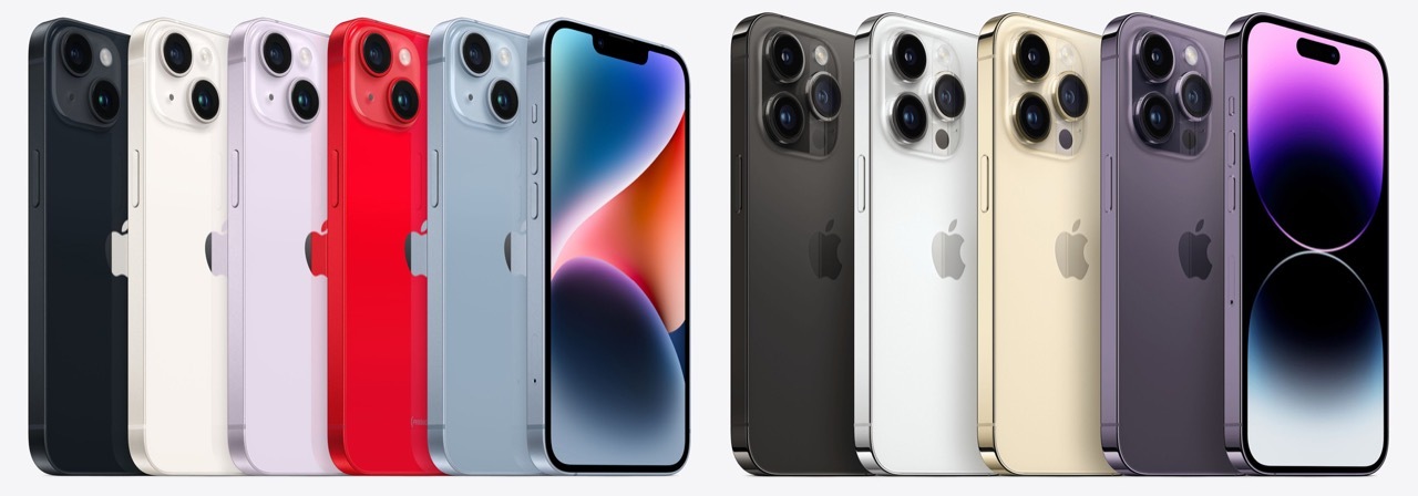 아이폰14의 컬러는 미드나이트, 스타라이트, 블루, 퍼플, (PRODUCT)RED의 5색. 아이폰14 Pro는 스페이스 블랙, 실버, 골드, 딥 퍼플의 4색 중에서 선택할 수 있습니다.