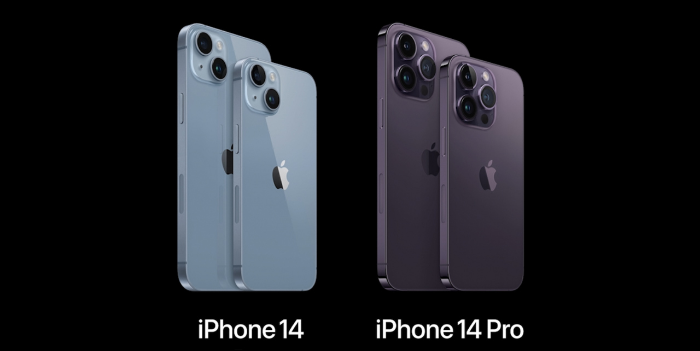 아이폰14와 아이폰14 Pro는, 모두 플랫한 측면의 프레임과 유리를 조합한 상자형의 디자인을 채용.