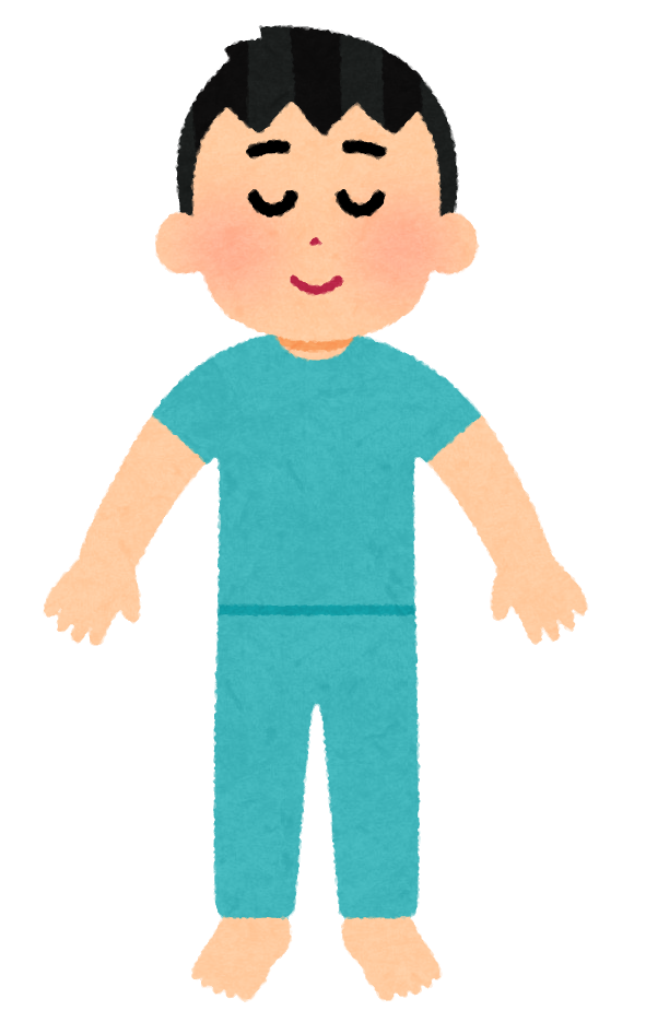 머리와, 어깨 등의 부위가 가장 편해지도록 베개를 조절합니다. 팔은 힘을 빼고 조금 구부리고 몸통의 옆에 손바닥을 아래로 둔다. 손가락은 다소 늘어나 자연스럽게 구부러지도록 하며 몸통을 만지지 않도록 합니다. 이들 중 하나가 부족하면 바람직하지 않은 효과가 발생할 수 있습니다. 매트리스나 베개 등 부드러운 것을 사용하면 오히려 머리와 어깨가 긴장하는 사람도 있습니다.
