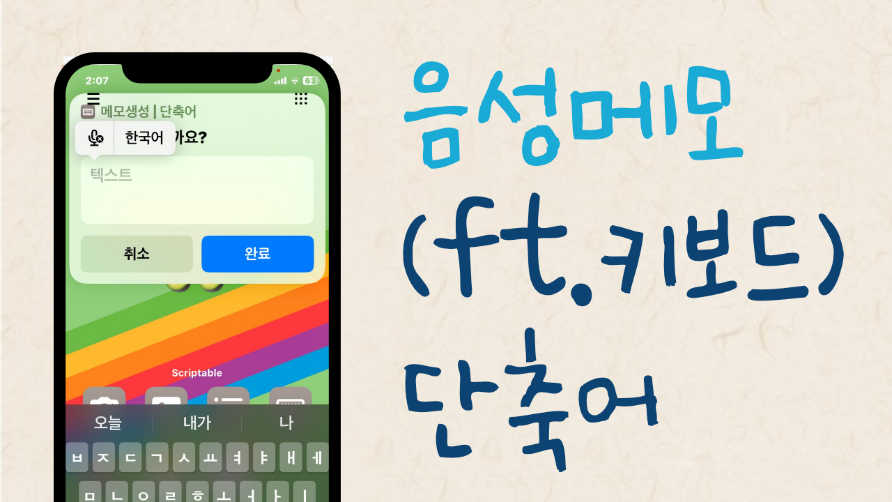 아직 단축어의 명령이 부족하여 자세한 제어는 불가하여 한번에 간단하게 음성메모를 하며 키보드를 사용할 수는 없지만, 키보드를 사용하게 되면 더 편리하게 음성메모를 할 수 있습니다.