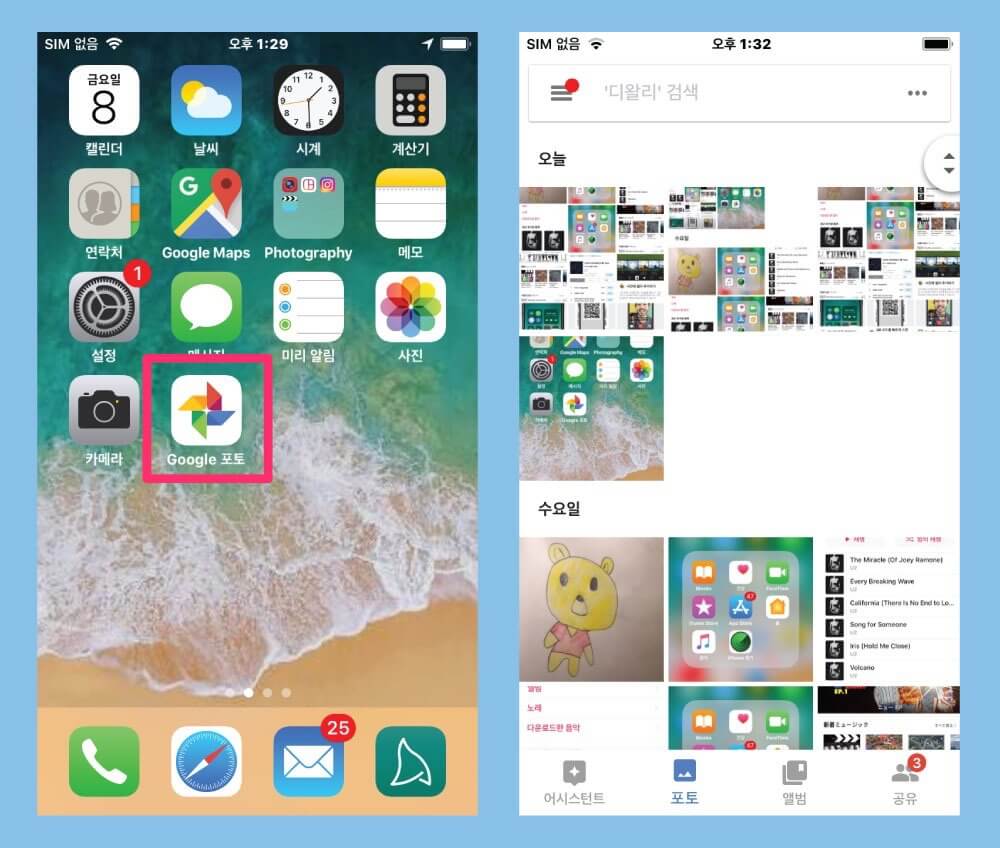 먼저 구글 포토를 실행합니다(구글포토 앱이 없다면 앱스토어에서 다운로드를 받아야 합니다) 그러면 아이폰 안의 사진이 클라우드로 동기화가 됩니다.