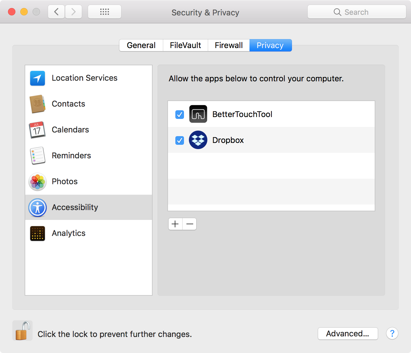 설치를 했다면 가이드에 따라 BetterTouchTool을 사용하기 위해서는 “환경 설정→보안→ 접근성 ‘에서’보조 장치에 액세스 할 수 있도록한다’ 에 체크를 해 줍니다.