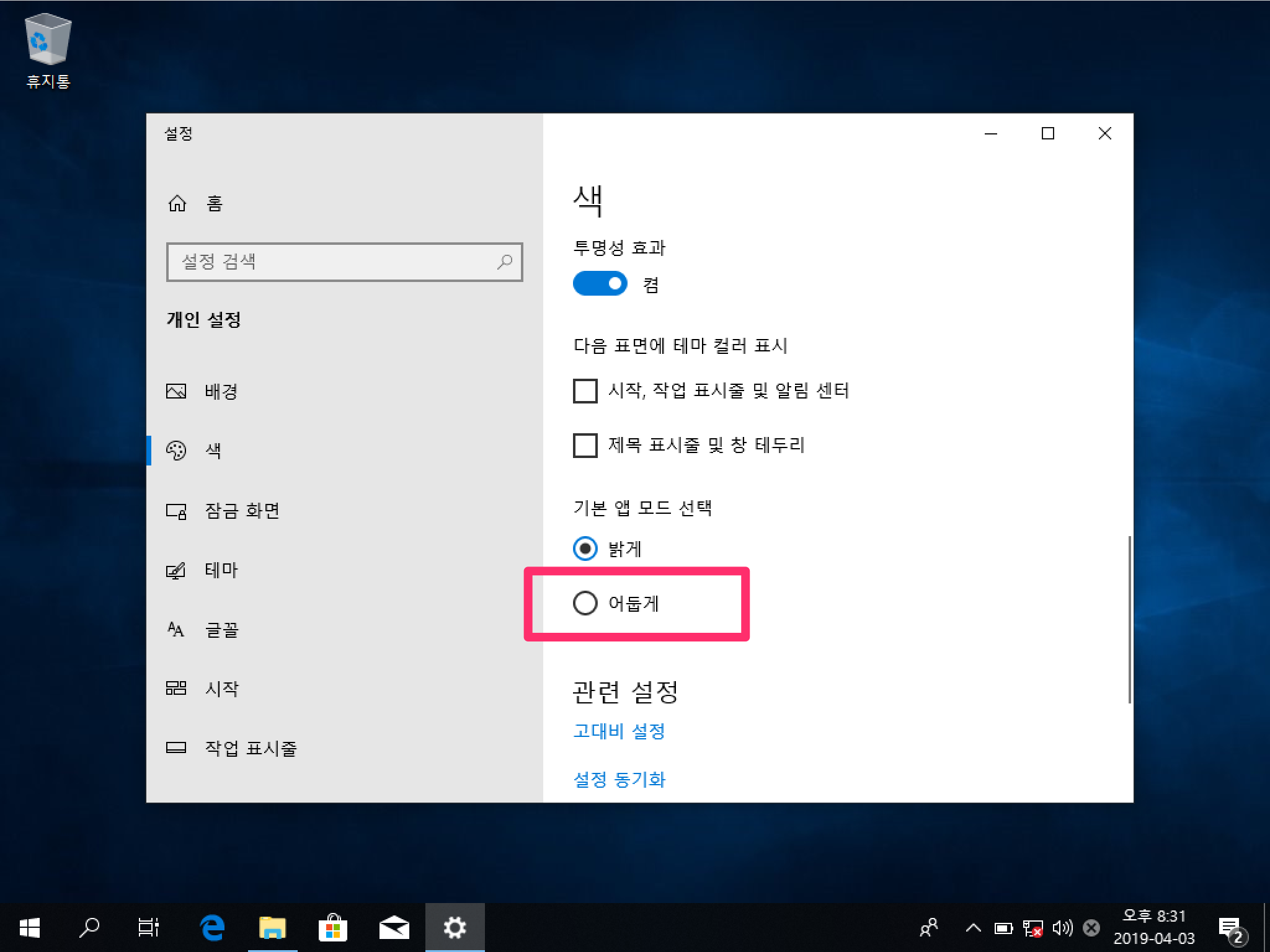 색을 선택하고 밑으로 화면을 내리면 기본 앱 모드를 선택이라는 항목이 나오는데요.
