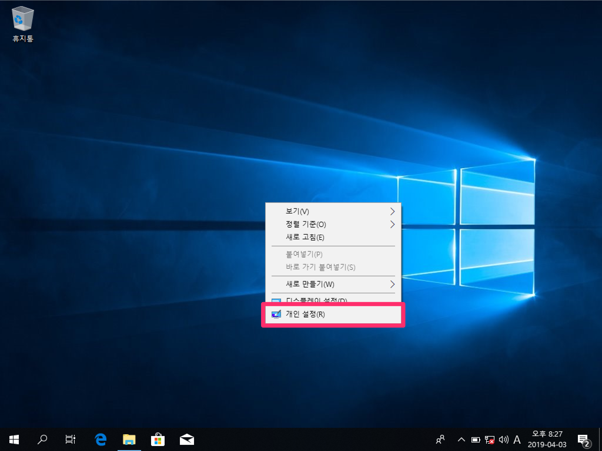 먼저 바탕 화면에서 오른쪽 마우스 버튼을 클릭해서 개인설정을 선택합니다.