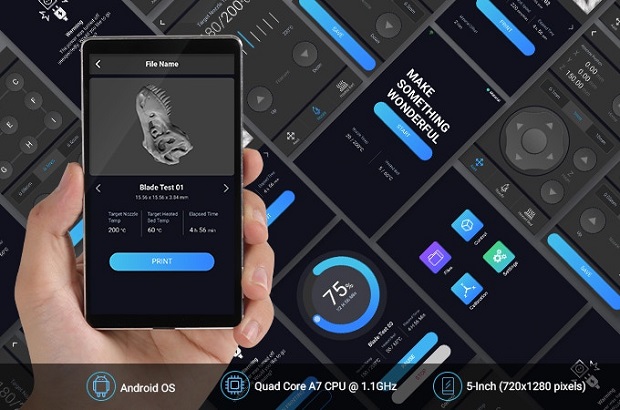 본체 크기는 A150이 470 × 380 × 390mm, A250이 600 × 510 × 490mm, A350이 700 × 660 × 580mm. 3D 인쇄의 최대 조형 사이즈는 A150이 160 × 160 × 145mm, A250이 230 × 250 × 235mm, A350이 320 × 350 × 330mm. CNC의 경우는 이보다 높이가 낮아집니다. 모바일 터치 스크린은 기존 3.2 인치에서 5인치로 확대했습니다.