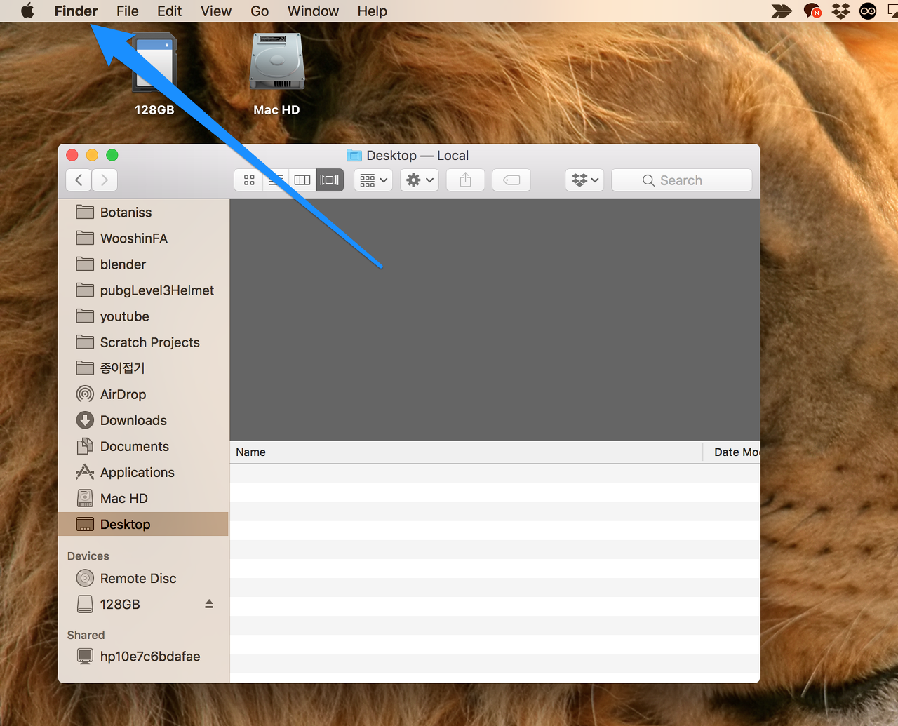 그런데 데스크탑 아이콘 숨기기 설정은 설정 파인더에서 해야 합니다.. 엑? 파인더라구??.. 네 파인더를 여시고, 아래와 같이 상단바의 Finder를 누르시고, preference 을 눌러줍니다.
