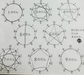 1단부터 9단까지 한 단 에 하나씩 동그란 원으로 나타내는 것인데요. 각각의 원에는 0부터 9까지의 눈금이 균등하게 적혀 있고, 0에서 시작해서 곱셈의 한자리 숫자를 차례로 선으로 연결합니다.