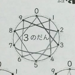 1단부터 9단까지 한 단 에 하나씩 동그란 원으로 나타내는 것인데요. 각각의 원에는 0부터 9까지의 눈금이 균등하게 적혀 있고, 0에서 시작해서 곱셈의 한자리 숫자를 차례로 선으로 연결합니다.
