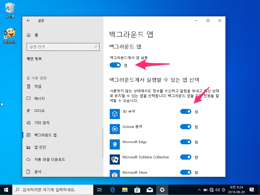 윈도우 10 은 "응용 프로그램의 백그라운드 실행" 이 처음부터 활성화되어 있기 때문에 필요한 것만 활성화 시키거나 전부 비활성화를 시켜 줍니다.