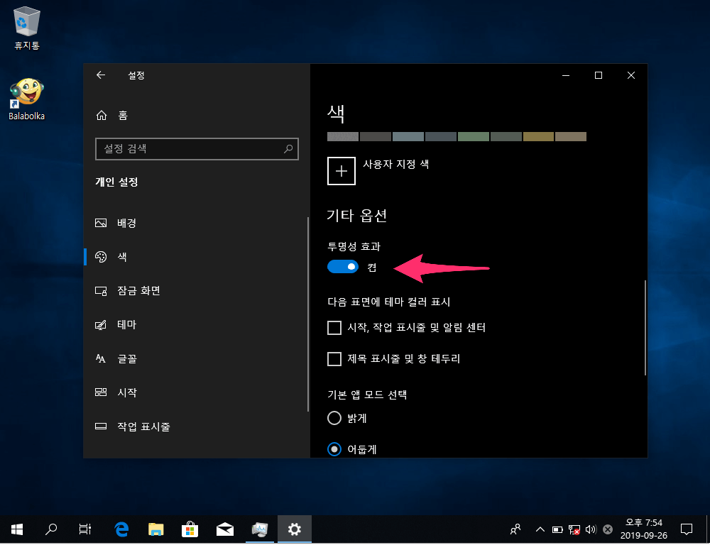 - 기타옵션의 투명성효과를 비활성화 시킵니다.