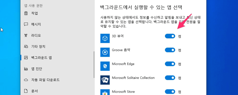 - 좌측 배너에서 백그라운드 앱을 선택합니다.