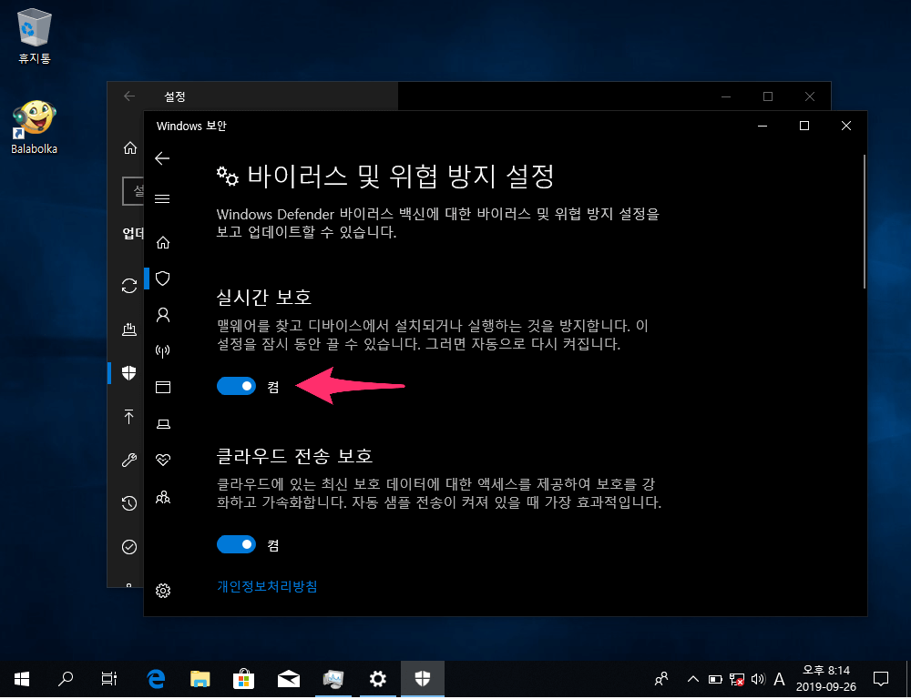 - 실시간 보호를 비활성화 시킵니다.