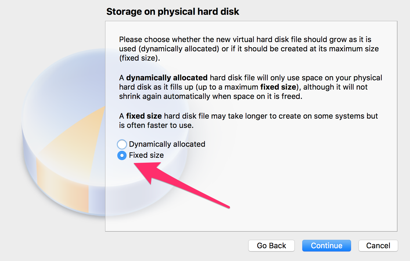 그러나 설치할 하드디스크의 용량을 고정으로 하는 편이 가변으로 하는 것보다 성능이 좋은 때문에, 고정 크기 가상 하드 디스크를 만듭니다.