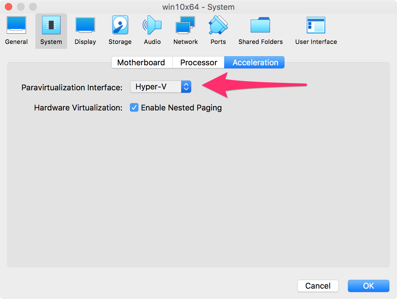 시스템> Acceleration (가속) 으로 이동해서 항목을 를 「KVM」 혹은 「Hyper-V」로 설정합니다. 가상화 인터페이스의 종류는 잘 "Linux라면 KVM" "Windows라면 Hyper-V" 라고 하는데, 큰 차이는 없는 듯 합니다.