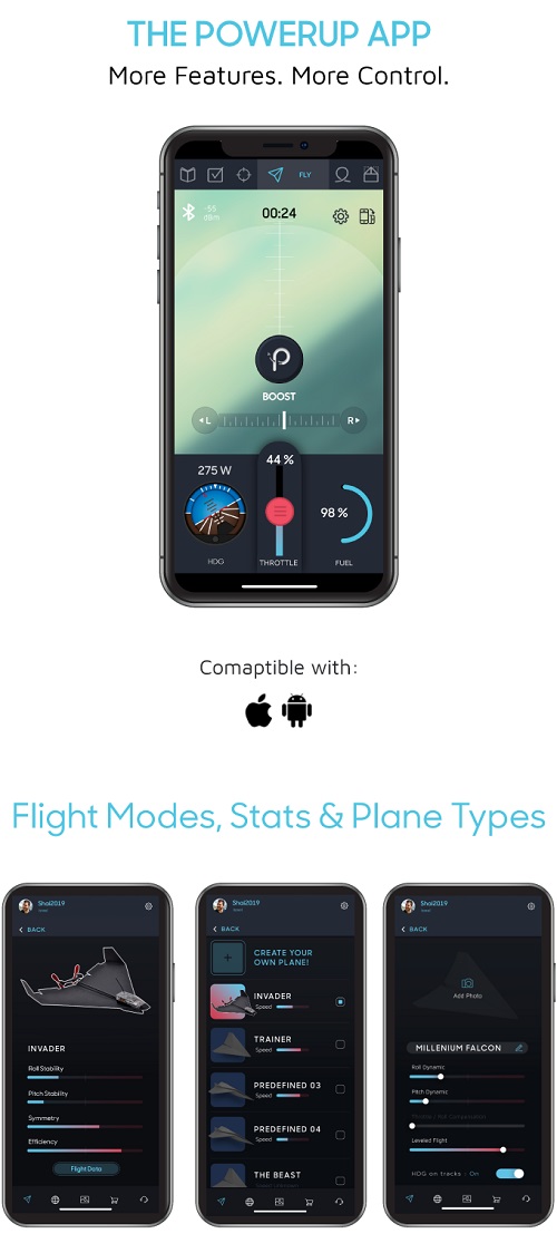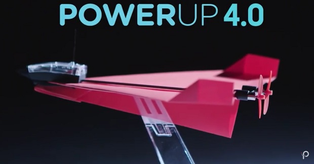 POWERUP 4.0 는 프로펠러, 모터, Bluetooth 등을 탑재 한 모듈로, 종이 비행기와 함께 사용하면 스마트 폰 앱에서 상승 하강과 좌우 회전 등을 조종할 수 있습니다.