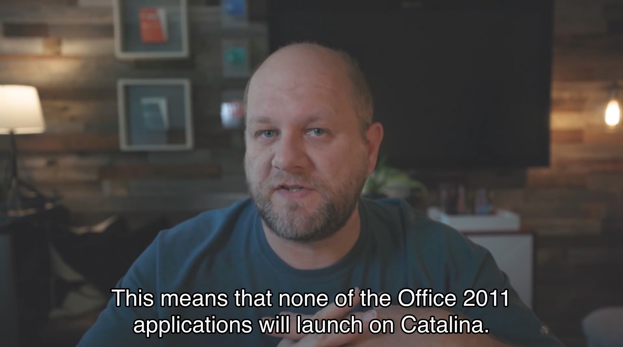 macOS 10.15 Catalina는 32-bit 애플리케이션 지원 종료에 따라2017 년에 지원이 종료한Office 2011 for Mac은 완전히 작동하지 않을때문에 Office 2011을 맥에서 사용하고 계신 분들은 카탈리나 업데이트에 주의하시기 바랍니다.