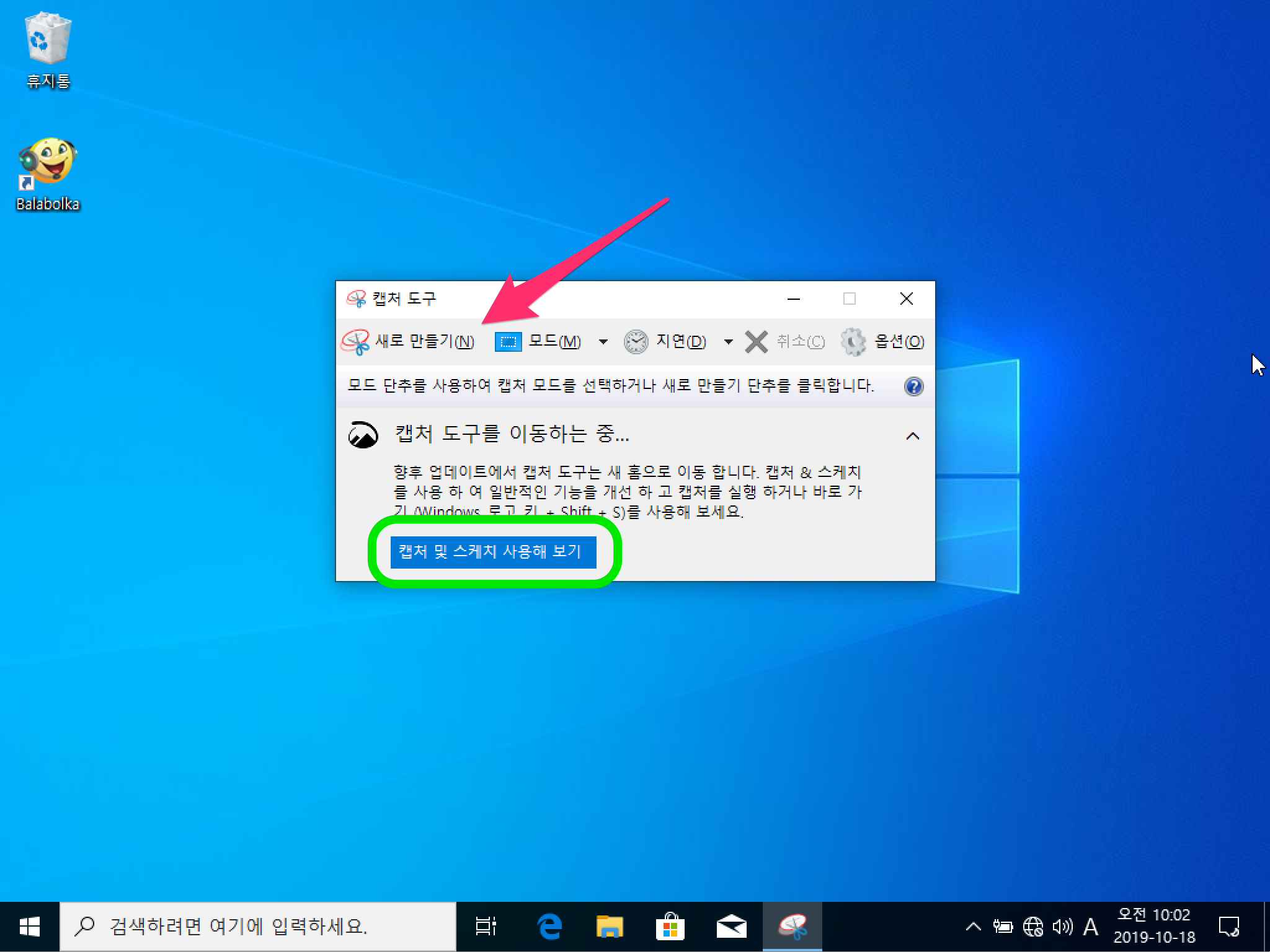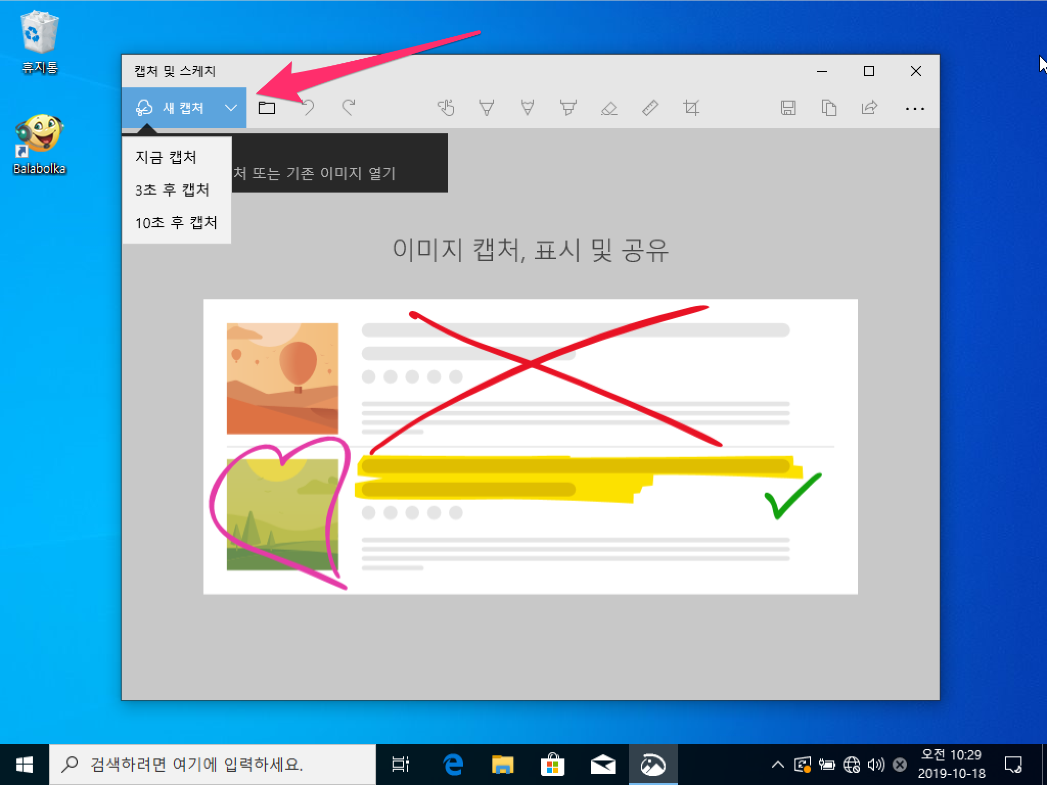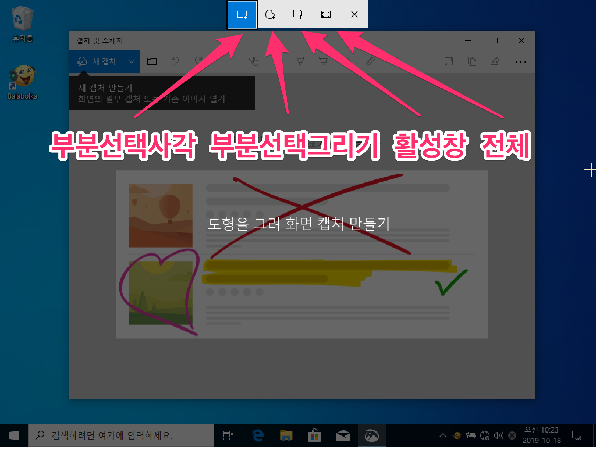 새로운 컴퓨터화면캡쳐 (스크린 샷) 응용프로그램인 캡처 및 스케치앱의 사용 방업을 설명합니다.