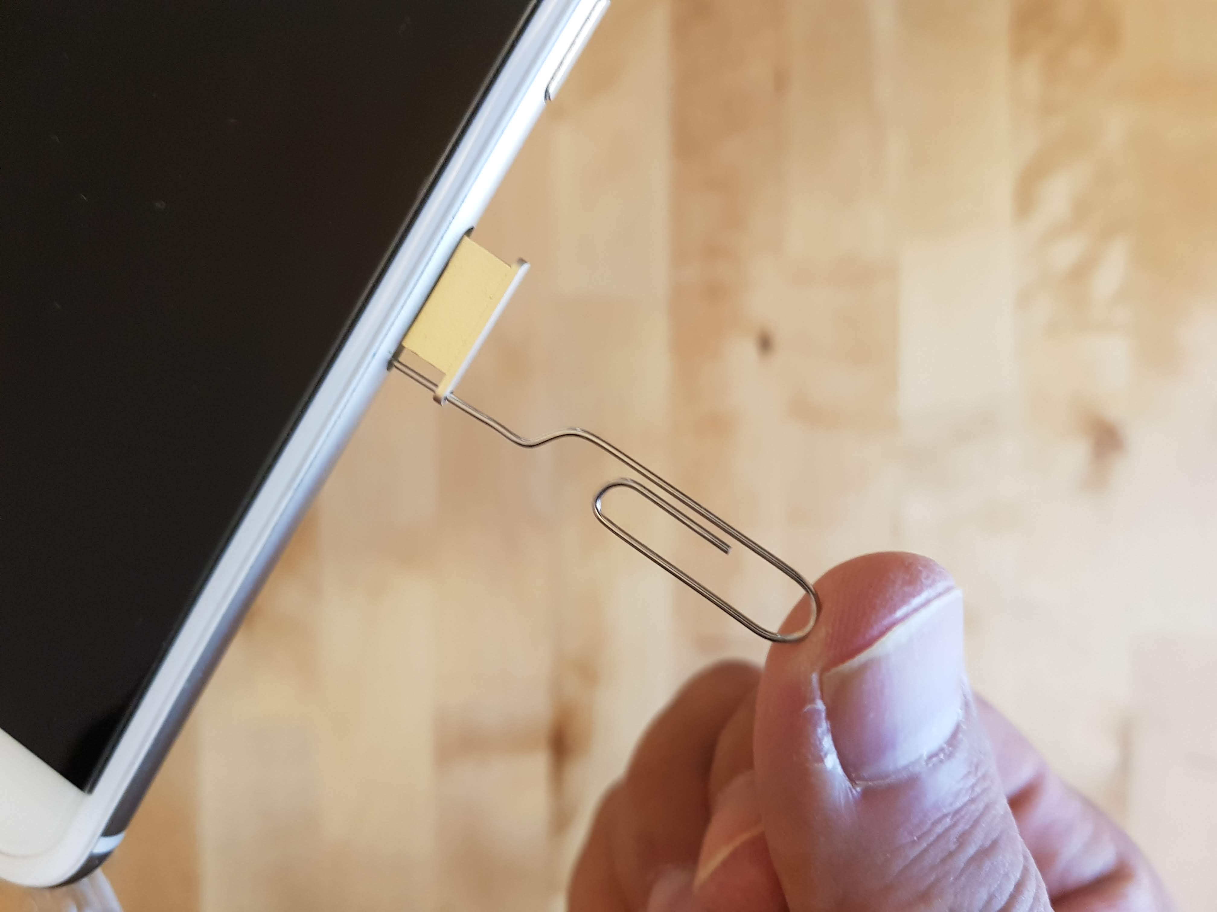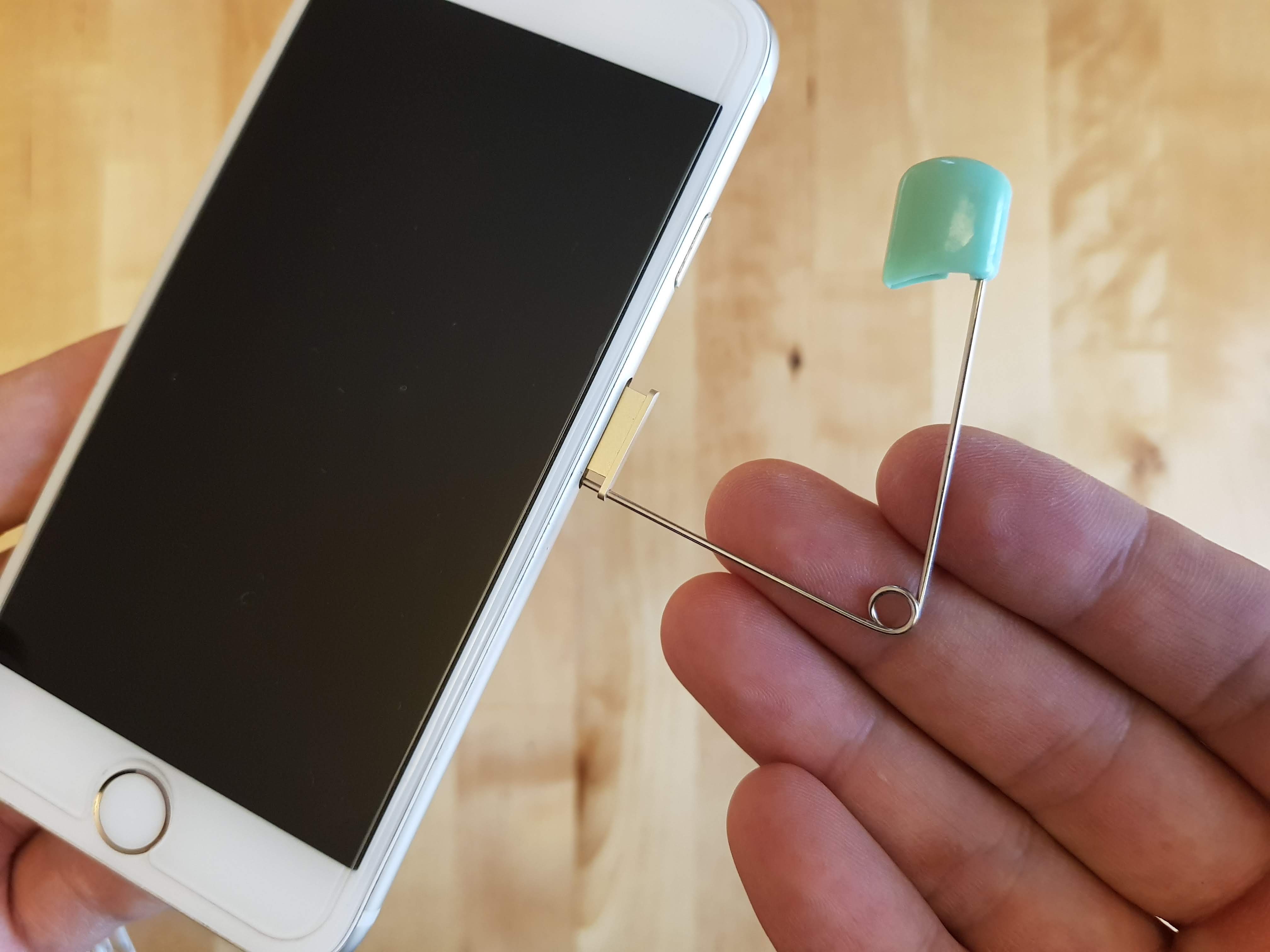첫 번째 대용품은 서류등을 정리하는데 사용하는 "종이 클립"입니다. 단지 그대로는 사용할 수 없으므로 이미지에서처럼 유심칩 트레이의 구멍에 꽂을 수 있도록 구부려 줍니다. 나머지는 일반 유심핀과 같은 요령으로 밀어 넣으면 유심 트레이가 열립니다.