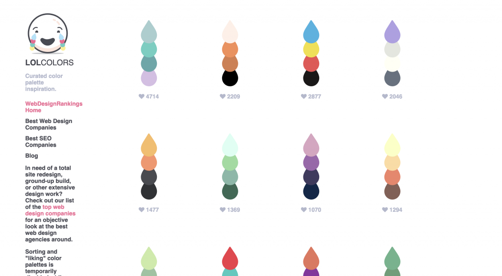 LOL Colors는 눈물 같은 드롭형 이미지가 귀여운 4 색의 배색 패턴 견본 서비스입니다. 여기도 즐겨 찾기 등록 수에 따라 색 구성표마다 인기도를 알 수있게되어 있습니다.