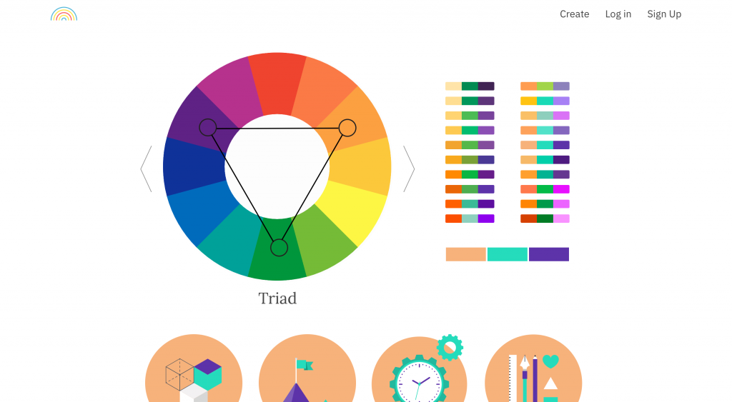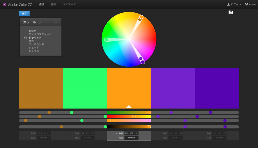 Adobe Color CC는 컬러 하모니 (색상끼리의 관계) 에서 뛰어난 배색 패턴을 생성 할 수있는 색상 생성기입니다.