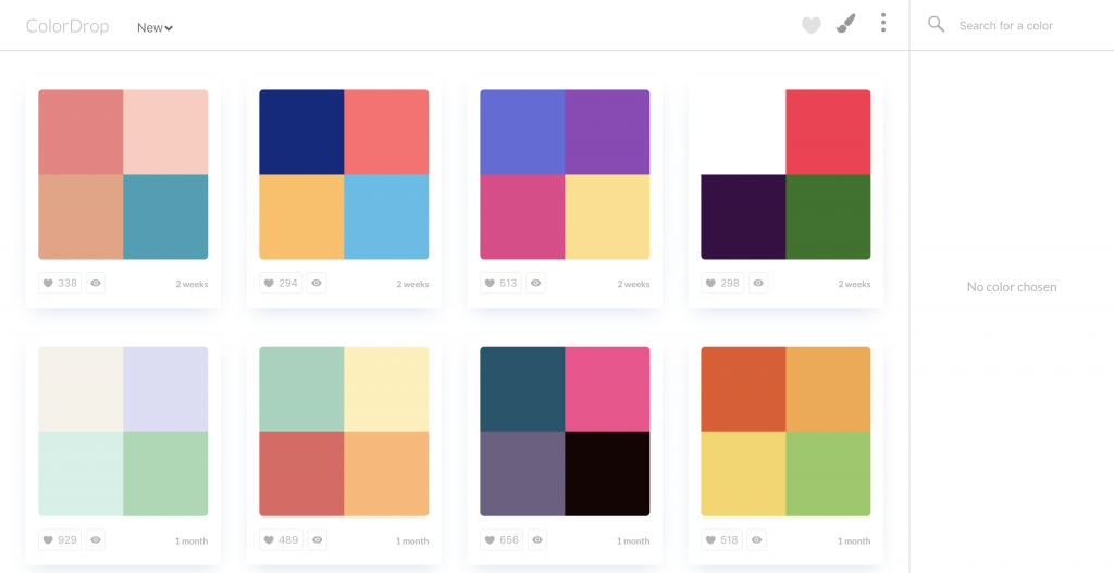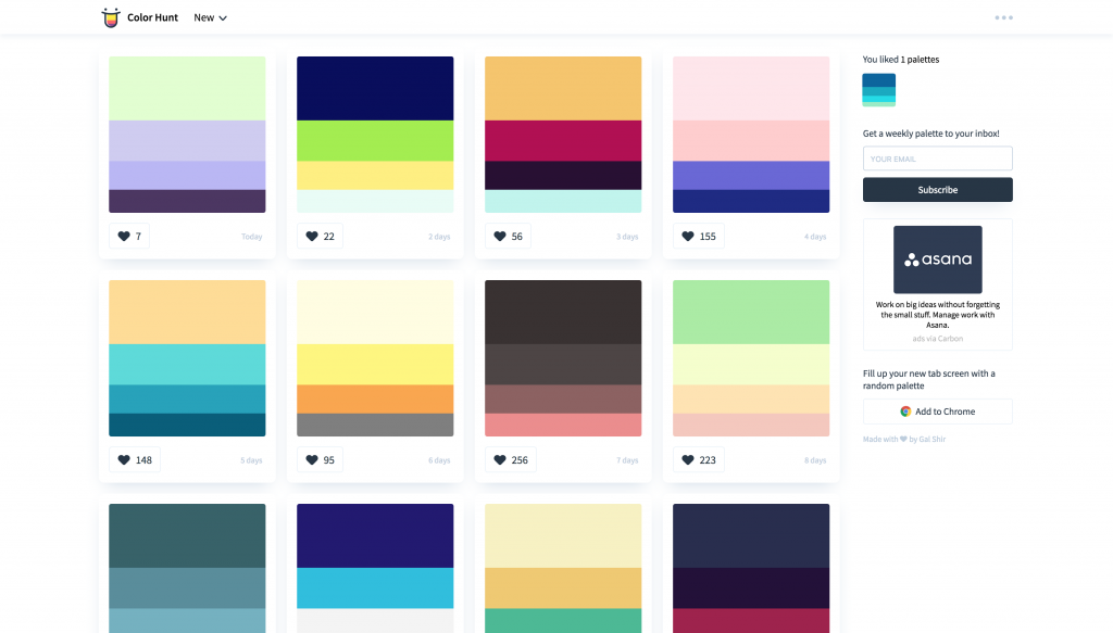 Color Hunt는 4 색 구성표가 게재되는 배색 패턴 샘플 서비스입니다. 전세계 사용자가 게시한 배색 패턴의 견본이 게재되어 있고, 즐겨 찾기 등록 수에 따라 각각의 배색 패턴 샘플의 인기를 알 수있게되어 있습니다.