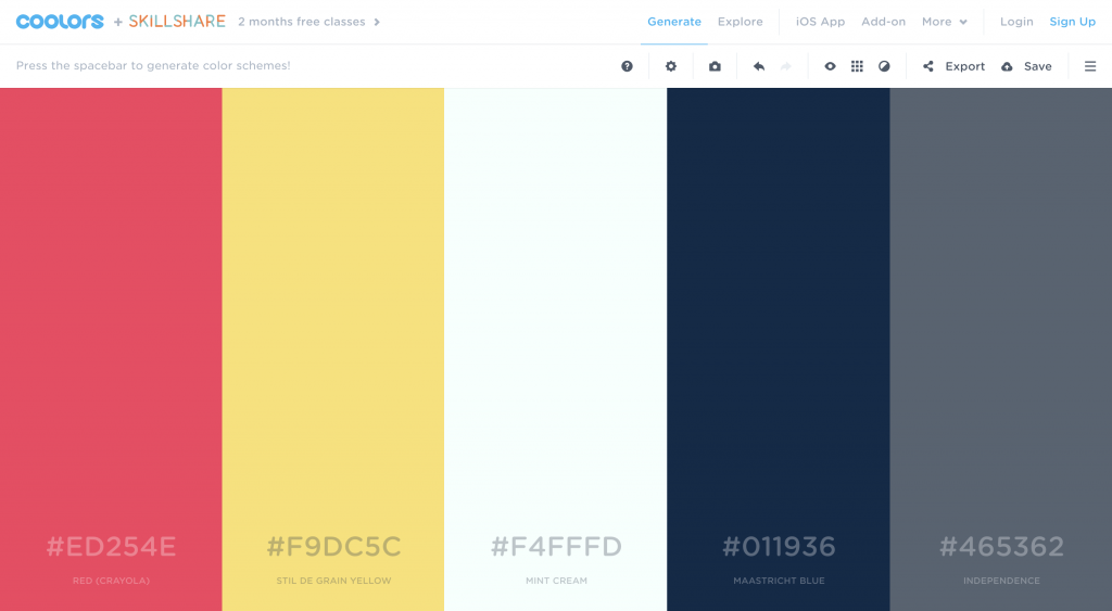 Coolers는 "스페이스 바"를 누를 때마다 다른 5 색의 배색 패턴 견본이 표시되는 색상 생성기 서비스입니다.