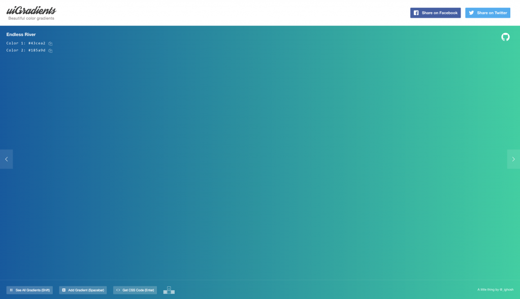 "uiGradients"는 두 가지 색상의 다양한 그라데이션 배색 패턴이 소개되어 서비스입니다. 엔터 키를 누르면 CSS 코드를 출력 할 수 있기 때문에, 그대로 CSS 파일에 붙여 넣으면 Web 디자인에 그라데이션을 도입 할 수 있습니다.