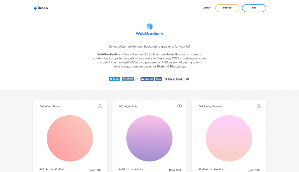 WebGradients은 다양한 그라데이션 배색 패턴 견본이 소개되는 서비스입니다. 비슷한 색을 사용하여 부드러운 그라데이션 패턴에서 보색을 사용하여 신축성이있는 그라데이션 패턴까지 다양한 종류의 그라데이션 배색 아이디어를 찾을 수 있습니다.