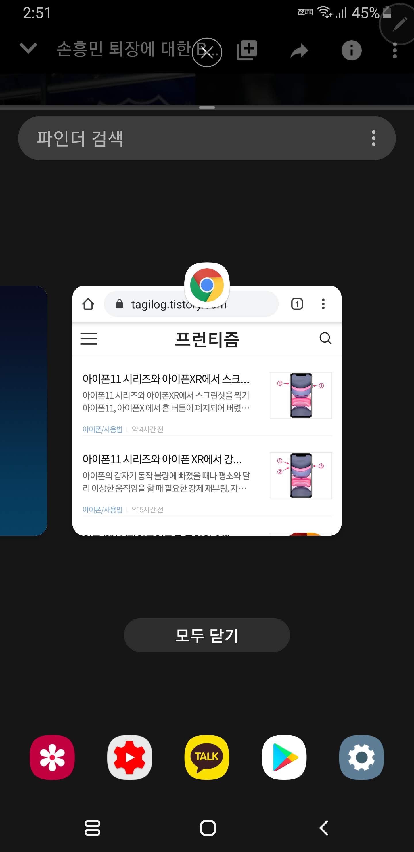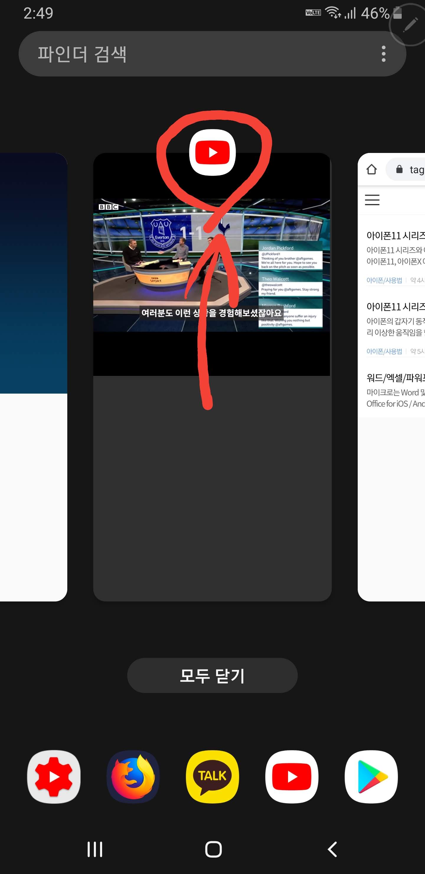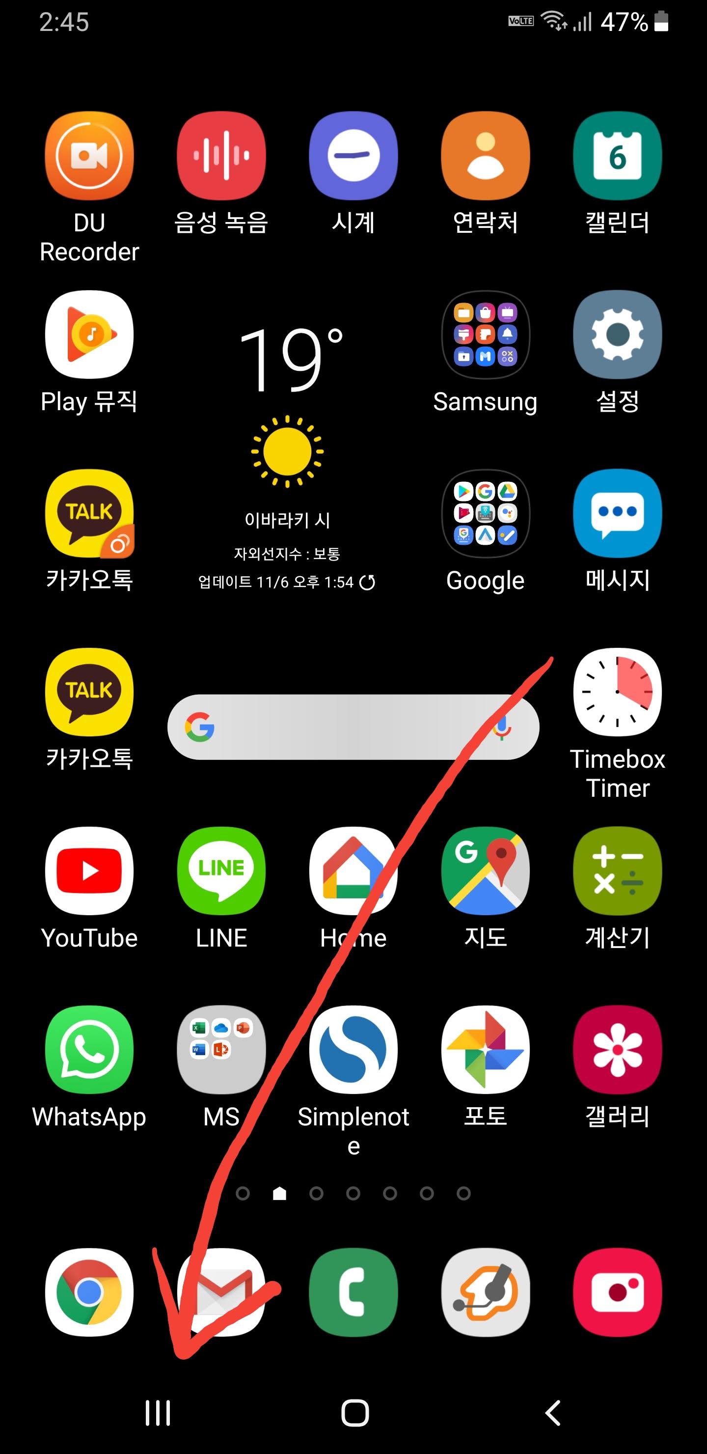 좌측하단의 최근앱 버튼을 누릅니다.