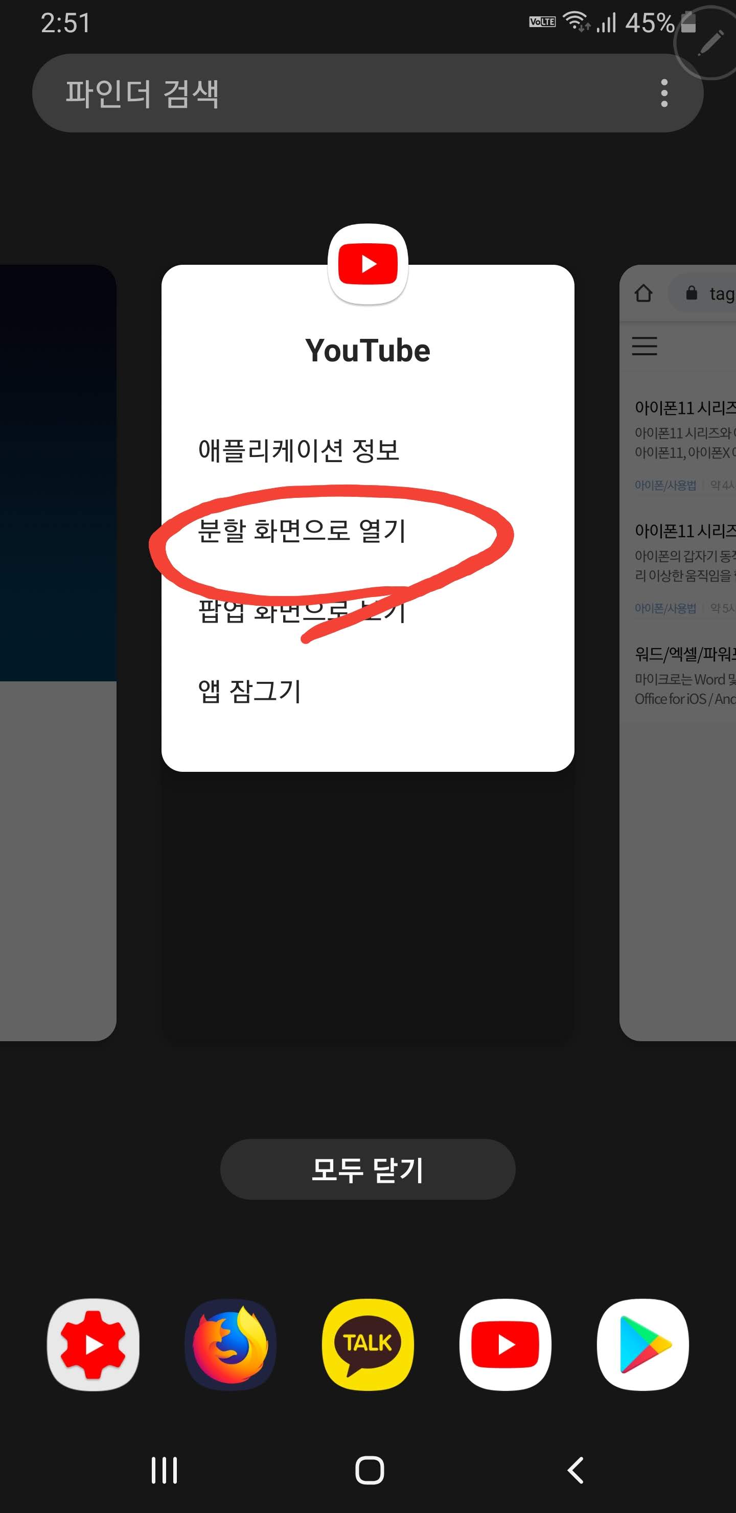 - 분할화면으로 열기를 선택합니다.