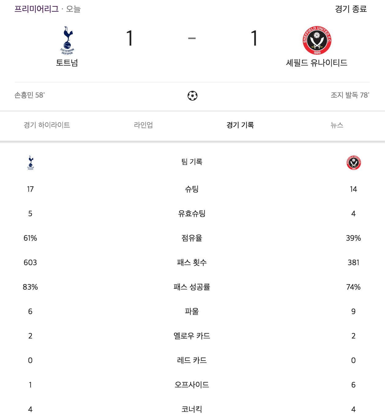 손흥민 선수의 골 이후에 금방 셰필드 선수에게
