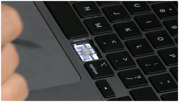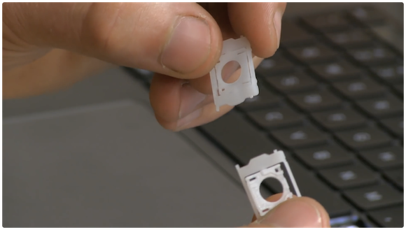 참고로 16 인치 MacBook Pro의 가위 식 키보드의 키 탑은 기타 피크 등을 꽂으면 쉽게 제거 할 수 있는데요. 키의 내부에는 정교한 도트 패턴의 백라이트와 빛의 누설을 방지 커버가 설치되어 있습니다.