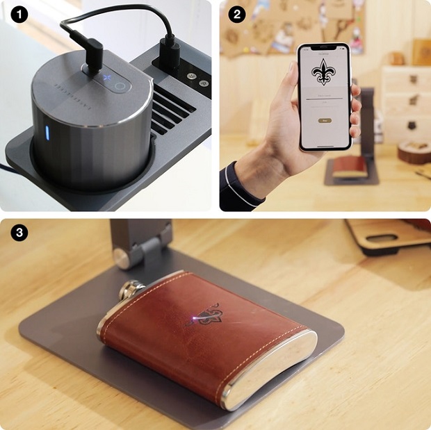 사용법도 간단하고, 레이저 헤드를 넣은 후 스마트 폰과 Bluetooth 연결하여 앱에서 각인을 원하는 디자인과 소재를 설정하기만 하면 됩니다. 앱에는 카메라 기능과 보정 기능도 있네요.