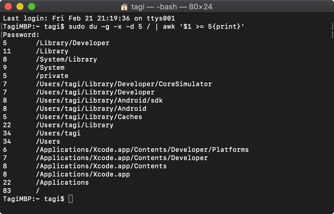 하드 디스크의 용량이 모자랄 때 터미널에서 아래와 같이 입력하면 5기가 이상의 폴더를 확인할 수 있습니다.