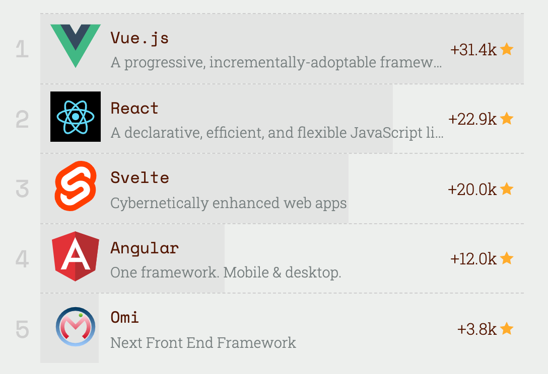 선발 기준은 심플해서 당해년에 늘어난 "스타의 수" 입니다. 참고로 2016 년 종합 순위 1 위는 Vue.js 2017 년 종합 순위 1 위는 Vue.js 2018 년 종합 순위 1 위는 Vue.js였습니다..
