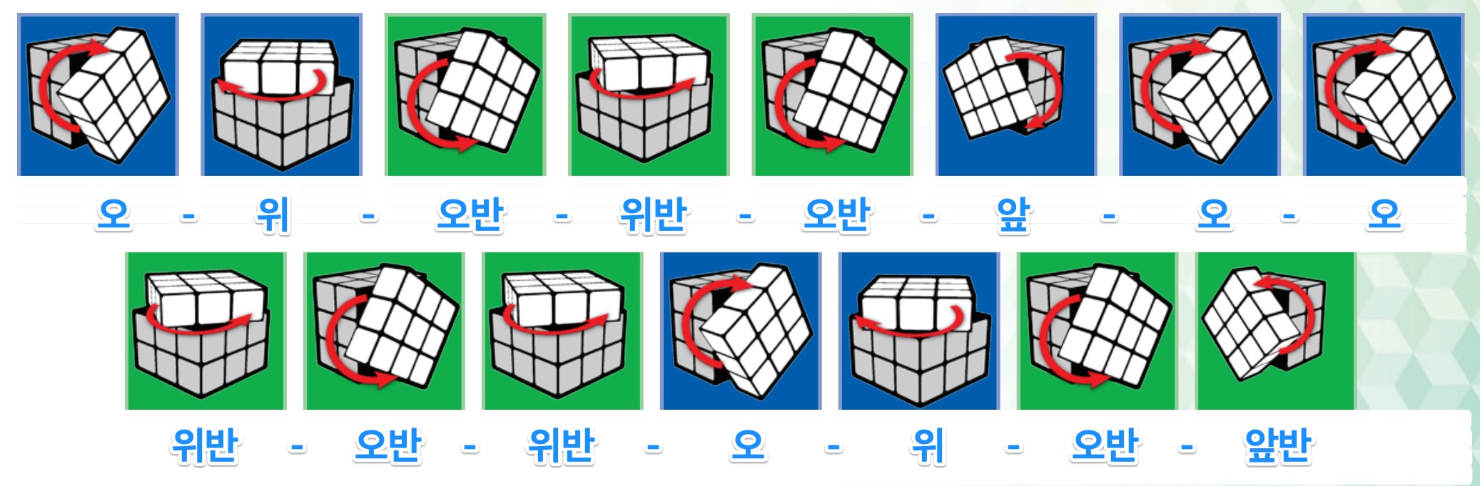 | 오 | 오른쪽면을 시계방향으로 돌린다 | 오반 | 오른쪽면을 시계 반대 방향으로 돌린다 |