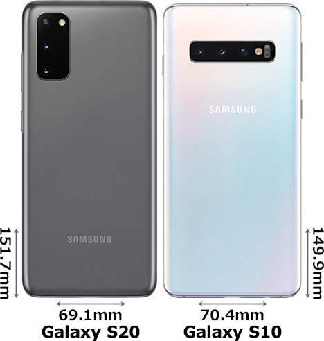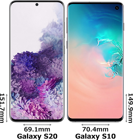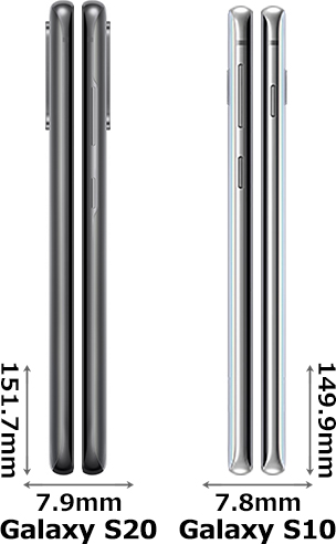 갤럭시 S10 은 6.1 인치 (3040x1440)에서 비율 19 : 9 이었지만, 갤럭시 S20 은 6.2 인치 (3200x1440)로 20 : 9 의 비율이 되었습니다. 본체 사이즈는 갤럭시 S20 가 갤럭시 S10 보다 폭이 0.9mm 좁고 높이가 1.7mm 크며, 두께가 0.1mm 두꺼워지고, 무게가 5g 무거워지고 있습니다. - [디스플레이]