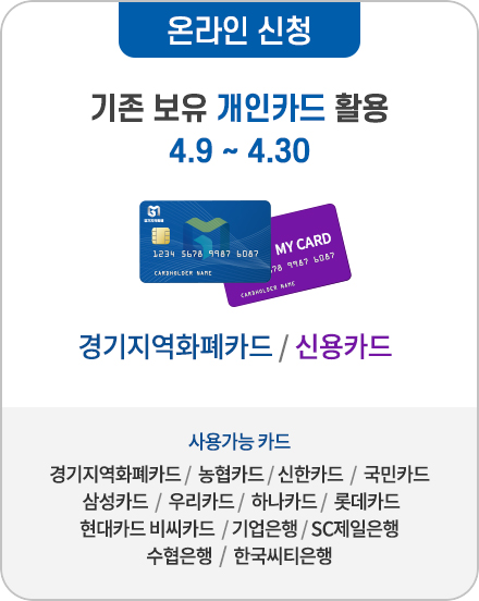 - 4. 9 ~ 4. 30(방법) 경기도 재난기본소득 홈페이지에서 경기지역화폐카드와 신용카드 사용 온라인 신청카드번호 본인 인증, 카드사 및 카드번호 등록 (미성년자는 대리신청 가능)