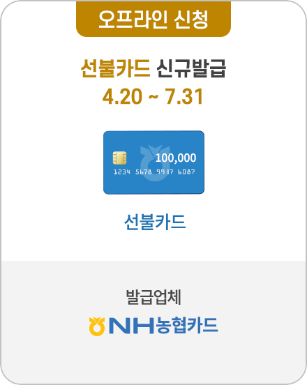 4. 20 ~ 7. 31(장소) 주소지 행정복지센터 또는 농협은행 방문 신청신분증 지참, 신청서(개인정보제공동의 및 위임 확인) 작성위임은 사전에 구두로 받고 신청서 위임란에 확인하시면 됩니다. 위임 받지 않고 신청서를 허위신청시 형사 처벌 될 수 있음