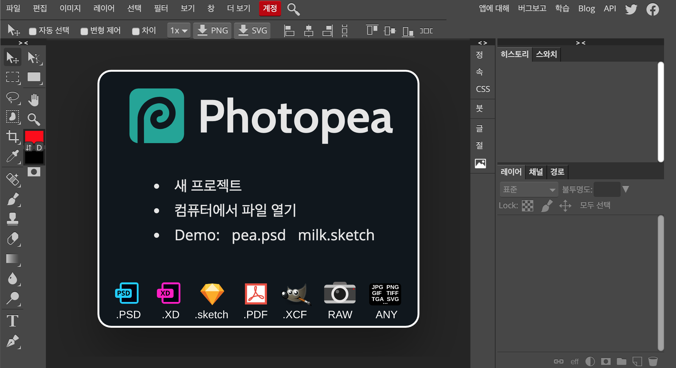 Photopea 포스터와 SNS 용 이미지 편집에 유용한 기존 템플릿 사이즈가 준비되어 있습니다. Photoshop에 이미 익숙한 사용자는 물론, 이미지 편집 초보자도 추천 무료 소프트웨어입니다.