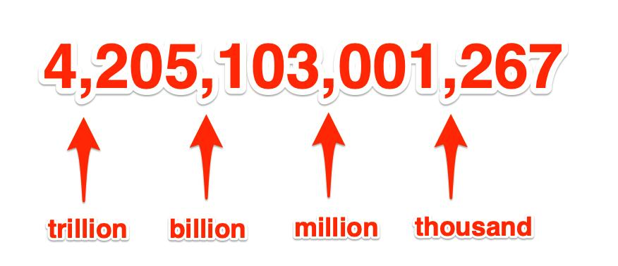 영어는 숫자를 읽을 때 "thousand" "million" "billion" "trillion"이렇게 3 자리마다 구분하여 읽습니다. 바로 이 3 자리 구분 을 의식하면 큰 숫자도 쉽게 읽을 수 있습니다 . 실제로 큰 숫자를 한번 보겠습니다.